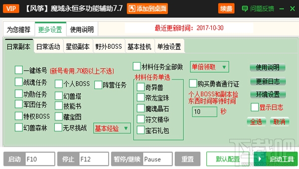 2、一键日常副本:一键练号、战魂任务、功勋任务、军团任务、特权BOSS、幻兽森林、个人BOSS、幻兽塔、技能书、藏宝图、无尽挑战、阵营任务;