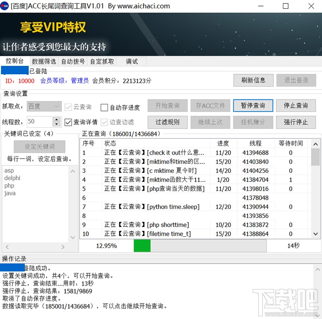 ACC长尾关键词查询工具是一款用于查询长尾关键词的客户端软件(爱查词)。它具有轻巧、快速、量大等特点,该软件分别吸收了百度、360搜索、搜狗、淘宝、bing等公司的相关数据,集合了他们的共性,存储到云端,可以采用客户端软件连接到爱查词的云端进行数据查询。获得的数据质量高、速度快。