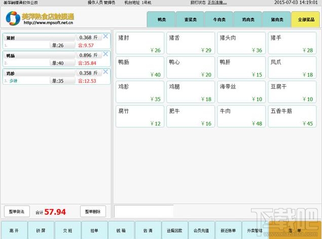 美萍熟食店触摸通是一款专为触摸屏POS机设计的软件,可完全脱离键盘鼠标进行全触屏操作,界面简洁、操作直观、技术成熟,完全切合行业特点,无需培训,最优点单流程,点单结账最快2秒,方便强大的退换商品功能,彻底解决业务中的困扰,让熟食店收银真正快起来;后台有完善的商品管理和强大的报表统计,让您的管理真正简单到底!广泛适用于需要称重业务的熟食店,凉菜店,小菜店等快速消费餐饮店面。