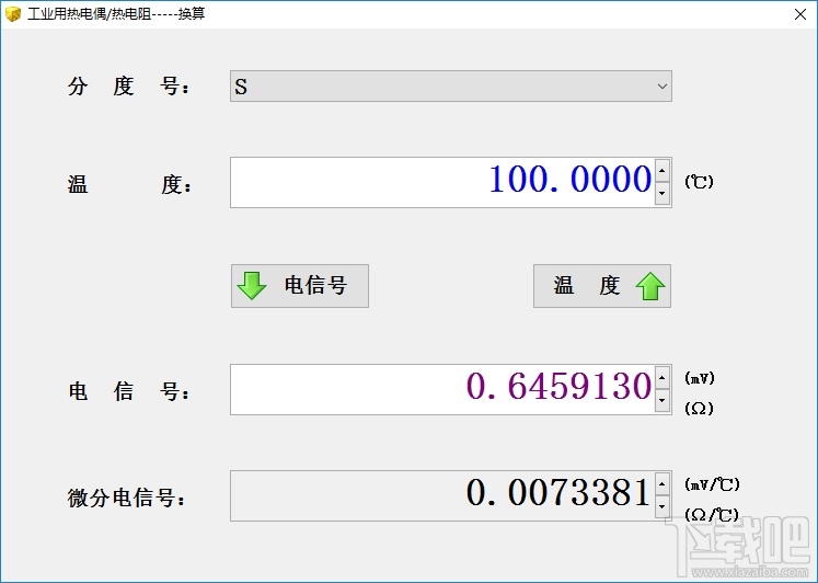 支持各种(工作用)热电偶、热电阻的换算。(S、R、B、K、N、E、J、T、Pt10、Pt100、Cu50、Cu100)