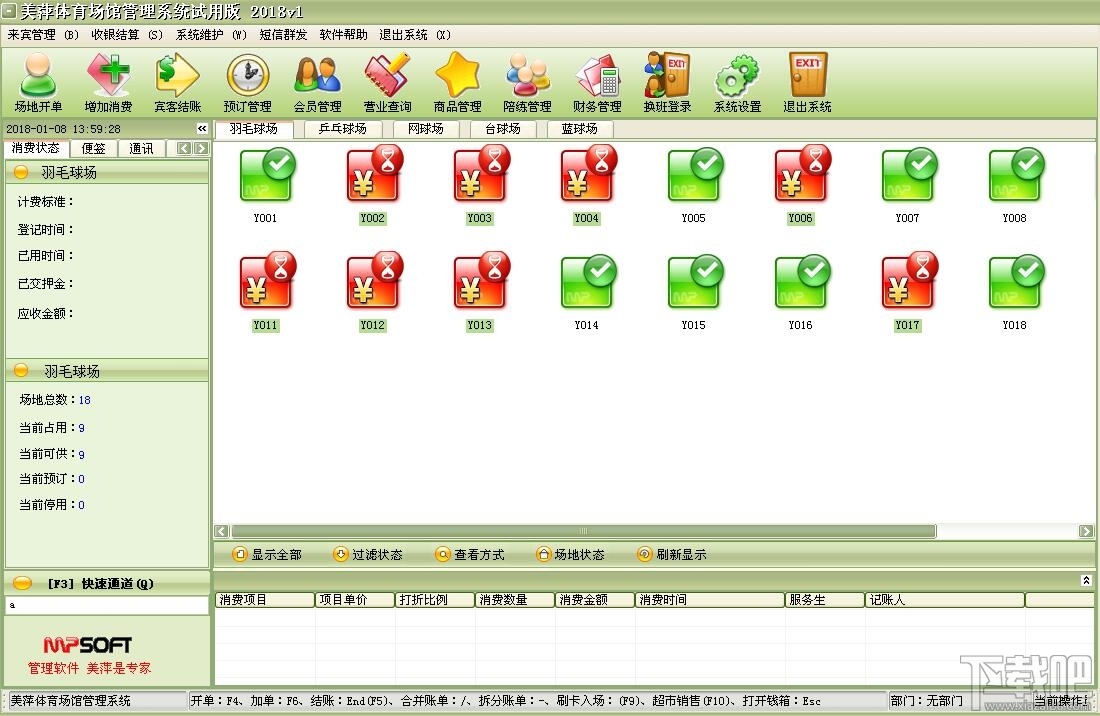 美萍体育场馆管理软件是一款专业的体育馆场地管理系统,球馆管理系统,它集前台收银收费 管理,一卡通功能,场地自动计费管理,场地预订,会员管理,陪练管理等强大功能为一身,系 统界面简洁优美,操作直观简单,无需专门培训即可操作使用。是羽毛球馆,乒乓球馆,网球场, 篮球场,台球厅等体育场馆管理信息化理想的管理软件。