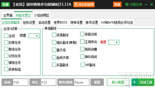 3、一键副本设置:资源副本、组队副本、通天塔、血战天策、兵器副本、侠客试炼、江湖传说、挑战剑魔、神兵挑战、VIP副本;
