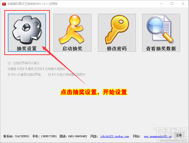 全能随机图文王,是一款奖品随机抽取的软件,设置简单,功能强大,完全自定义,是商场营销的必备武器。为绿色软件,免安装,下载后解压到电脑上既可以使用,设置好后复制到其他电脑上就可以直接使用。支持:xp、win7、win8、win10,是功能最强大的抽奖软件。