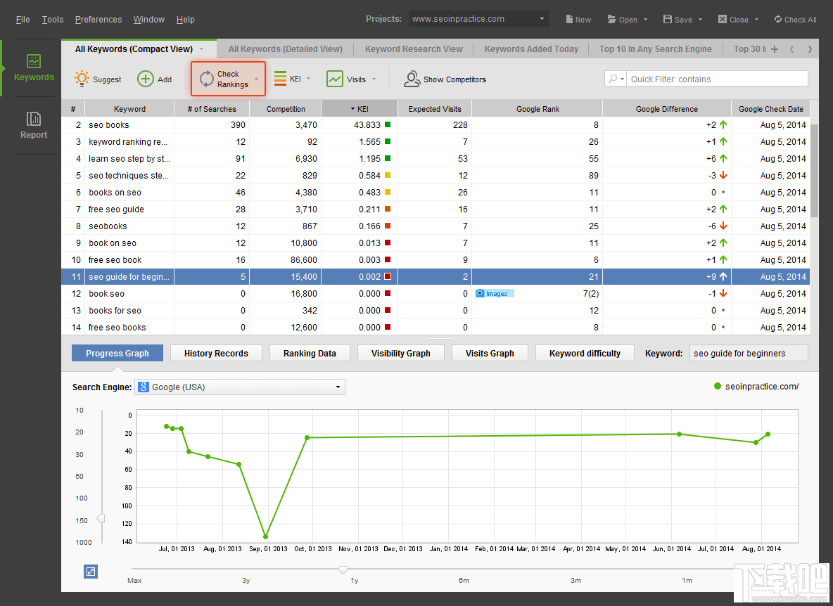 4、rank表示该关键词的排名,progress graph表示该关键词一段时间内的排名,可以选择7天,一个月,三个月,六个月等等。