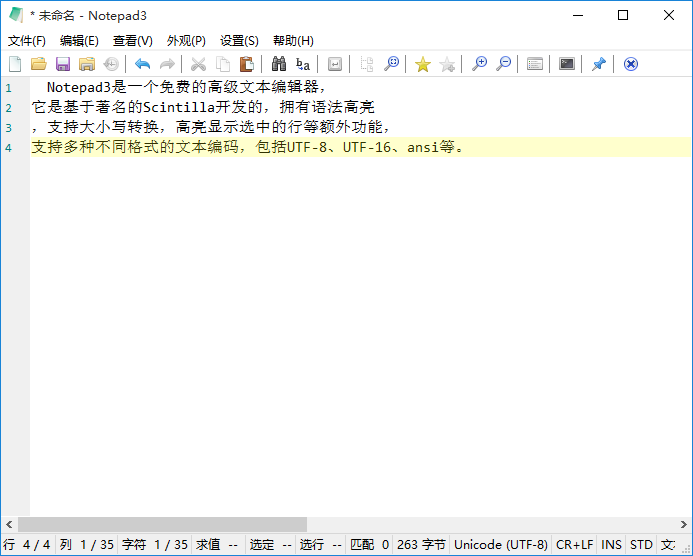 3、语法高亮。Notepad3支持很多不同语言的语法高亮,包括ASP, assembly language, AutoHotkey, AutoIt3, AviSynth, Bash, BAT, C, C++, C#, CMake, CoffeeScript, Common Gateway Interface (CGI), Cascading Style Sheets (CSS), DIFF, HTML, INF, INI, Inno Setup, Java, JavaScript, LaTeX, Lua, Markdown, NSIS, Pascal, Perl, PHP, Python, REG, Ruby, SQL, Tcl, Visual Basic (VB), VBScript, VHDL scripts, XHTML, XML, YAML ,NFO ANSI。