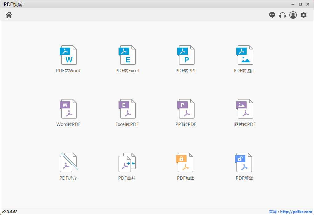 1、双击软件进入PDF快转功能管理页面,该页面可以点击选择多种文件转换方式,点击图标即可进入对应页面进行文件转换