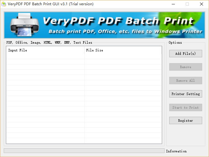 VeryPDF PDF批量打印GUI支持将Office文档,HTML文档和各种图像格式批量打印到计算机上安装的Windows打印机,使您能够打印比其他打印机驱动程序更多的文件格式。打印Office文档时需要MS Office软件。