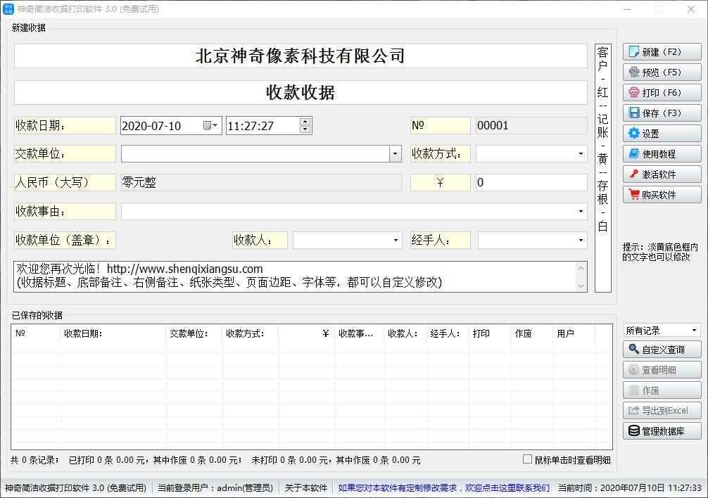 神奇简洁收据打印软件是一款非常专业且优秀的收据打印软件,可帮助用户快速将收款收据进行打印,提供收据模板,不用自己手写或在网上查找,直接在模板上录入相关数据,完善相应的信息即可,提供多种不同的收款方式,自动显示大写人民币,使用起来更加方便,打印之前,可预览编辑好的收据,检查无误后,再进行打印,收据保存后,可自动记录,将所有记录按时间进行了分类,如本年记录、本月记录、本周记录等,支持自定义查询,通过具体的收据单号或者其他相关信息即可进行查询,欢迎有需要的用户下载体验