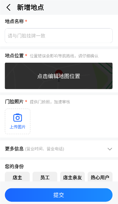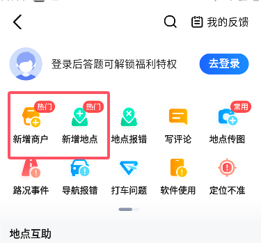 3、在我的反馈频道中,可以找到添加商铺、新增地点等功能,根据自己的需求选择。