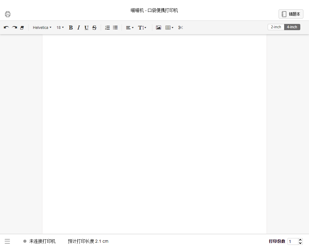 喵喵机PC客户端是一款界面干净简洁、功能强大的打印软件,该软件可以帮助用户进行文本编辑、文本打印功能,帮助用户进行各种文本编辑和打印,用户可以通过该软件直接将文本复制粘贴到软件上或者直接在软件上进行文本编辑,非常的方便快捷;喵喵机PC客户端支持打印文档、照片和各种数据文件等多种功能,通过该软件可以进行各种文件编辑然后进行打印,该软件内置表格插入、屏幕截屏等功能,在编辑文本时可以点击进行图片插入,操作非常简单方便。