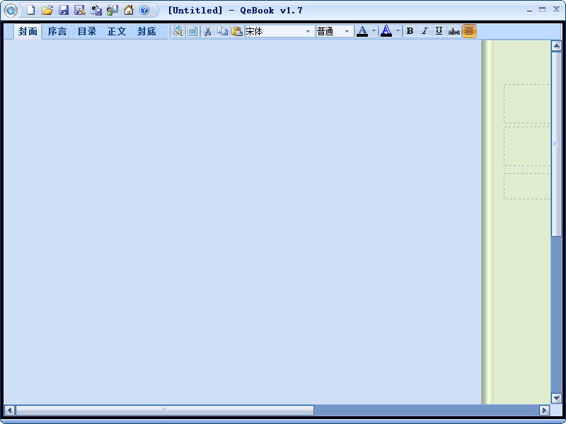 QeBook是一款非常简单且实用的电子书制作工具,可帮助用户快速制作电子书,可新建文档,提供不同的文档类型,包括普通、相册、连环画、Flash合集、音乐盒,可对文档制作信息进行编辑,更加全面的介绍,电子书制作分为五个部分,包括封面、序言、目录、正文和封底,每一个部分都支持添加背景,还可添加背景音乐,并可对目录进行编辑,提供多种多样的字体,可对编辑内容的字体进行修改,也可对字体颜色进行设置,支持添加下划线效果,总之这是一款非常好用的软件,如果您有需要,那就赶快下载体验一下吧!