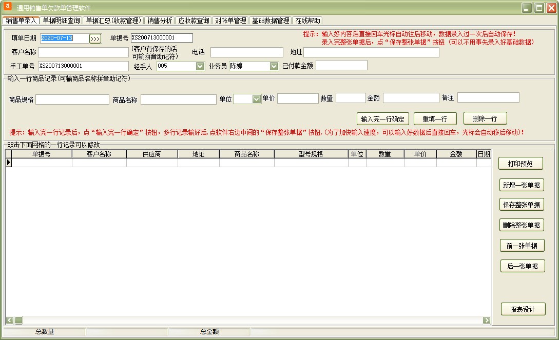 通用销售单欠款单管理软件是一款非常专业且优秀的销售单欠款单管理软件,软件界面简洁直观,清晰可见功能菜单,拥有七个功能区,全部显示在同一界面,便于用户快速选择,每个功能区对应相关的操作区域,销售单录入后,自动显示单据号以及自动计算商品总金额,支持打印预览,可预览打印效果,更加人性化的设置,支持查询功能,提供不同的查询条件以及排序条件,可按单据号和客户名称进行排序,从多个方面对销售单进行管理,还有其他相关功能,赶快下载亲自体验一下吧!