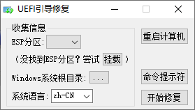UEFI引导修复是一款小巧简单的UEFI引导修复工具,众所周知,当启动盘的UEFI引导文件损坏之后是不能启动系统的,当您启动系统出现故障时,可能就是因为UEFI引导文件损坏或者是ghost文件还原64位系统到C盘中导致系统故障;目前市面上有许多的UEFI引导修复工具,基本上所有工具的修复能力都相差不大,因为修复的原理都是大同小异,这款软件的优势在于使用简单,只需要选择好UEFI文件的保存路径,就可以一键对它进行修复,这对于很多不太懂计算机的用户来说,具有非常友好的操作体验。