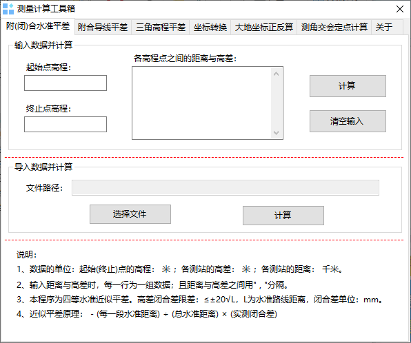 测量计算工具箱是一款由个人推出的免费计量软件,可以计算等水准近似平差,图根导线1:500近似平差,大地坐标转空间直角坐标,大地坐标正反算,测角交会定点计算等项目,软件的界面比较简约,功能也比较简单,没有其它繁杂的功能,拥有直观的工作区,为了让用户在使用过程中不会产生任何障碍,软件特意在每一个测算的项目底部做了专业的解释说明,通过说明解释之后,用户会更加容易的使用这款软件;软件在测试过程中没有报毒,并且没有广告和闪退的情况出现,需要的朋友可以放心下载使用。
