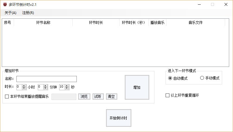 多环节倒计时是一款非常简单且实用的多重计时器,软件界面简洁直观,功能菜单一目了然,可帮助用户进行倒计时,无需人工计时,以独特的数字电子时钟显示屏进行倒计时,更加直观的了解时间情况,在一些限时比赛中就可以用到这款软件,如歌唱比赛、演讲比赛、答辩等,自动帮您计时,使用起来很方便,可增加多个环节,自定义环节内容,包括名称和时长,环节结束后可播放提醒音乐,还可选择您喜欢的音乐进行设置,支持试听,提供不同的进入下一环节模式,如自动模式和手动模式,这么好用的软件,赶快下载试试吧!