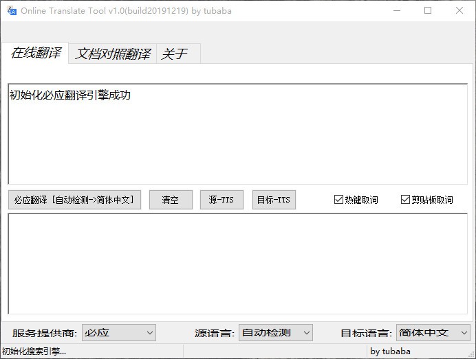 Tool是一款非常简单且实用的在线翻译工具,可帮助用户快速进行翻译,具备简洁直观的操作界面,旨在为用户提供最简单的操作,支持在线翻译,提供不同的服务提供商,如必应、百度、谷歌等,同时提供多种多样的目标语言,根据实际需要设置,源语言可自动检测,无需设置,只需输入相应的内容,一键即可进行翻译,快速且准确的输出翻译结果,还支持文档对照翻译,可自动进行翻译,还可将原始文档和结构文档对照查看,使用起来更加方便,欢迎有需要的用户下载体验