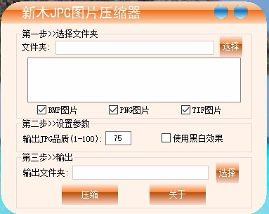 新木JPG图片压缩器是一款能够用来进行图片压缩的专业压缩处理软件,该软件能够帮助用户对图片进行批量的处理,能够将BMP、PNG以及TIF格式的图片处理为JPG格式进行输出,这一款软件的操作界面简洁明了,用户就算是没有使用过该软件,也能够快速的学会软件的操作方法,使用起来非常的方便,在使用软件进行图片的压缩时,用户可以在设置参数的步骤中直接填写对应的输出品质,这里主要推荐将品质设置在70左右,这样的图片输出效果最佳,而且用户还可以在设置参数的时候勾选使用黑白效果,这样输出的图片就是黑白的。