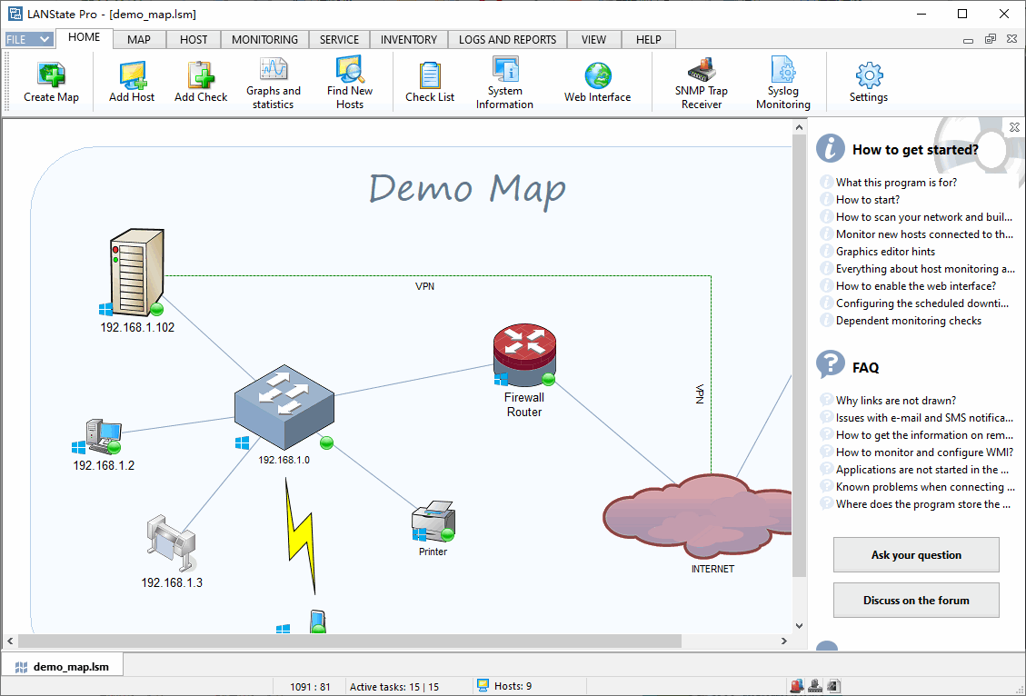 LANState Pro是一款强大的网络映射监视和管理软件,该软件可以帮助用户管理网络上设备,可视化的管理方案使用户管理所有计算机都非常简单;LANState结合了友好的界面和许多必要的网络管理功能,在广泛搜索功能中可以自动检测网络设备,然后生成网络图以图像的方式表示网络设备的布局;这款软件可以轻松地制作专业的网络原理图,只需按一下按钮,LANState Pro不仅可以提供网络快照,还可以提供IP,MAC和状态信息等详细信息查询,从安全的角度来看,它还允许客户端查看谁连接了网络以进行安全检查,有助于防止未经授权的访问。