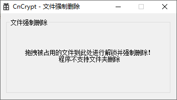 CnCrypt是一款强制文件删除软件,它可以轻松删除电脑中一些强制占用内存的文件;有些时候,您会发现您的计算机中有一些文件不能删除,或者删除之后又恢复,这样会导致计算机的内内存被大量占用;CnCrypt是是一个免费且使用简单的文件删除工具,优势在于可以强制的删除我们不需要的文件,直接将需要删除的文件拖曳至软件中,软件就会从电脑中彻底将该文件删除,并且删除之后,文件不可恢复,需要的朋友可以下载使用,尝试无毒无广告,可放心使用。
