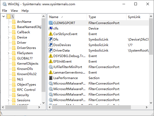 2、通过winobj,我们可以轻松查看系统的当前内核对象和名称空间。