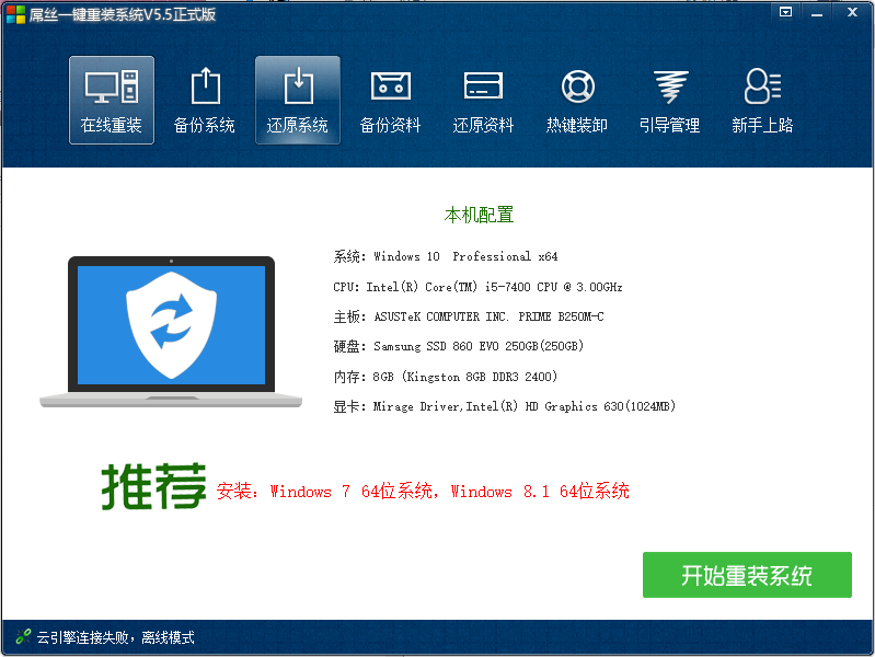 支持电脑安装环境配置检测功能,可以帮助用户进行本机配置检测,推荐合适的系统版本进行安装