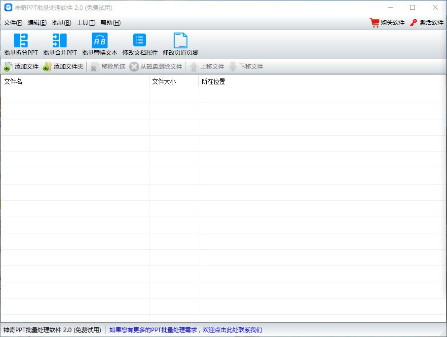 神奇PPT批量处理软件是一款非常专业且优秀的PPT文档批量处理工具,可帮助用户快速对PPT文件进行处理,支持批量处理,将多个PPT文件统一进行操作,集中显示在文件列表中,便于管理,一打开软件,清晰可见软件功能,且所有功能显示在同一界面,便于用户快速选择需要使用的功能,如批量拆分PPT、批量合并PPT等,添加文件后,可自动计算文件大小,还可上移或下移文件,自由调整文件在列表中的位置,改变文件拆分合并的顺序,提供使用教程,了解具体的操作方法,这么好用的软件,赶快下载试试吧!
