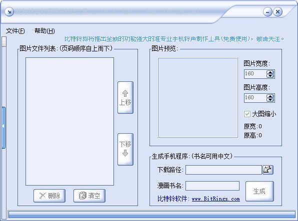 比特铃手机漫画制作工具是一款非常简单且实用的手机漫画制作软件,可帮助用户快速制作手机漫画,可直接在软件浏览电脑本地图形文件,快速选择需要的图片,支持添加多张图片,集中显示在图片文件列表中,便于管理,页码顺序自上而下的进行排列,提供图片预览区,图片添加后,可在该区域预览图片,支持自定义图片宽度和图片高度,可选择大图缩小,效果满意后,再进行制作,接下来的操作非常简单,设置好下载路径,输入漫画书名,一键即可生成,这么好用的软件,赶快下载试试吧!