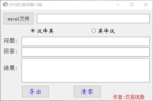 DIY词汇默写器是一款非常简单且实用的词汇默写器,可帮助用户默写词汇,我们在学习英语单词的时候,经常会默写单词,以便加深记忆,检验记单词的成果,而大多数情况下只能用纸默写,没有默写的工具,这时候就可以用到这款软件,直接在电脑上默写单词,可将需要默写的单词导入excel词汇库,添加excel文件至软件,支持汉译英,同时也支持英译汉,可根据中文意思默写出对应的英语单词,也可根据英语单词写出中文意思,自由切换单词,进行多个单词的默写,使用起来很方便,可将答题记录导出,便于后续查看,欢迎有需要的用户下载体验
