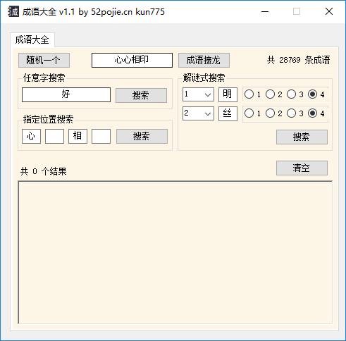 可以搜索指定位置的指定内容,对包含输入字符的成语进行搜索