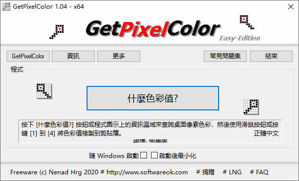 GetPixelColor是一款轻小的颜色拾取工具,它可以拾取桌面上任何颜色并生成六种常用的颜色代码,用户可以使用数字按键快速将这些代码复制到剪切板中;这款软件很适合图像设计师或者想要学习图像设计的朋友,因为这款软件可以帮助他们快速获得对应的像素颜色,不仅方便使用还容易理解;软件不需要使用时置于电脑右下的任务栏中,只需要轻轻一点就可以打开识别工具,识别完成之后自动弹出颜色面板并生成对应的颜色代码,平时不会影响用户工作,需要的朋友欢迎下载。