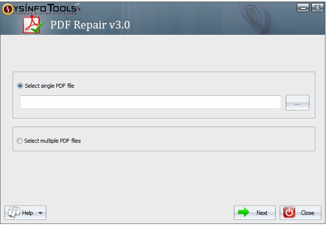 1、启动SysInfoTools PDF Repair v3.0软件窗口,以恢复损坏的PDF文件。 “选择单个PDF文件”或“选择多个PDF文件”选项可恢复pdf文件。