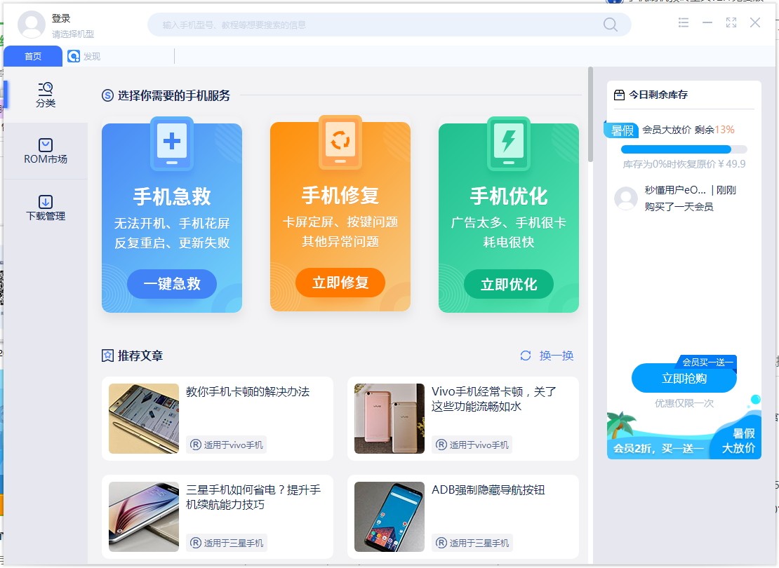 秒懂手机刷机助手是一款功能强大、专业使用的手机刷机软件,该软件支持多款手机进行刷机操作,支持微信扫码自动获取机型和手动选择机型等功能,通过选择机型可以让软件可以精确的文件手机诊断问题并对其进行有效的优化;该软件支持多种ROM包,用户可以根据自身情况进行下载然后对手机进行双击或者其他操作;秒懂手机刷机助手界面干净简洁、操作简单,是一款专注于解决手机问题的管理工具,专门为为用户解决手机黑屏、花屏、自动重启等手机问题,是一款非常强大的手机刷机助手。