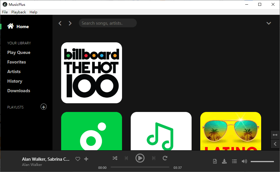 MusicPlus是一款强大的音乐播放器,与其它音乐播放器有所不同,该播放器主要用于收听国外音乐,该软件主要从国外的音乐平台中获取最新的音乐,让国内的用户可以轻松享受国外最新的音乐;MusicPlus有直观的音乐列表以及搜索功能,通过搜索功能可以让用户轻松的查找需要收听的音乐,并且软件支持在线下载,可以将喜欢的音乐直接下载保存在本地文件中进行离线播放;并且它也是一款强大的音乐管理软件,您可以使用它帮助您管理您本地上的音乐,轻松创建播放列表收藏音乐等。