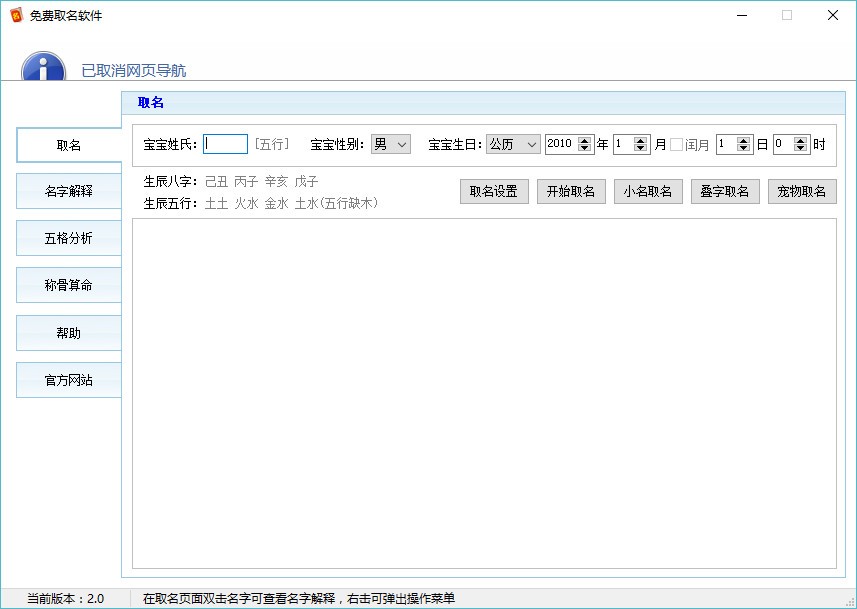 免费取名软件是一款非常专业且优秀的取名软件,可帮助用户快速进行取名,当您想要一个好听的名字,但是绞尽脑汁也想不到一个好听又适合的名字时,这时候您就可以用到这款软件,功能丰富,且所有功能集中并列显示在同一界面,便于用户快速选择需要使用的功能,包括取名、名字解释、五格分析和称骨算命,取名操作也很简单,只需输入姓氏,选择好性别和生日,一键即可进行取名,快速且高效的输出取名结果,还可显示生辰八字和生辰五行,这么好用的软件,赶快下载试试吧!