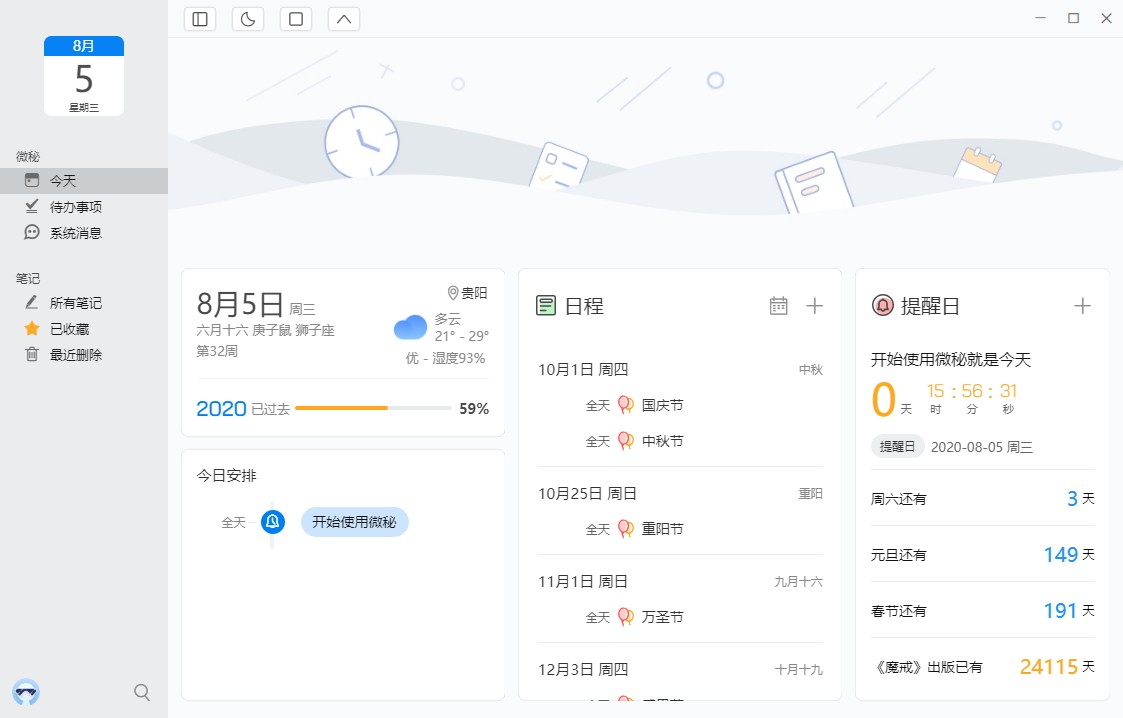 微秘全称叫微秘私人助理,是一款操作简单、方便实用的办公助手软件,该软件支持日程管理、日程提醒、代办事项和笔记管理等功能,可以很好的帮助用户进行日程安排和工作安排,帮助用户有序完成工作日程和日程安排;微秘这款软件支持Windows、mac、Android等平台进行使用,内置有笔记、日历、日程、打卡、订阅等多种特色小功能,可以辅助用户井然有序的完成各种工作和安排;该软件支持跨平台、云端数据同步,用户可以随时切换使用设备,不用担心数据丢失或者忘记数据传输等问题,非常方便好用。
