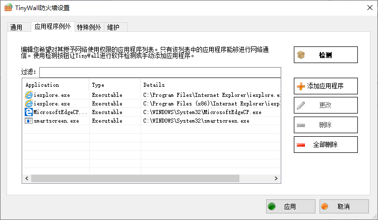 5、在“应用程序列外”界面中,您可以编辑您希望对其授予网络使用权限的应用程序,列表只有该列表中的应用程序能够进行网络通信,使用检测按钮让Tiny all1进行软件检测或手动添加应用程序检测。
