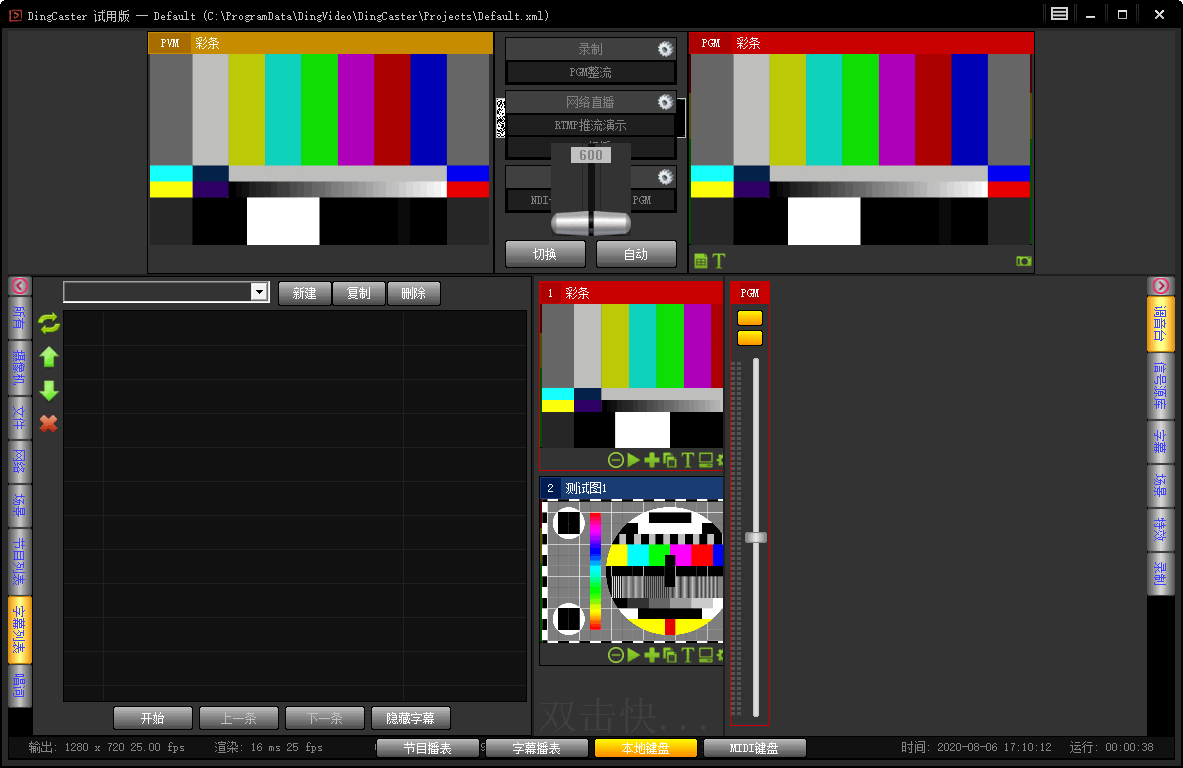 DingCaster是一款强大的导播软件,它可以应用于现场视频导播和流媒体文件的播放制作中,它的功能丰富,可以通过它进行在线导播,云导播,混合导播以及多平台播放等;它可以导入大部分流行的流媒体文件格式,包括:SDI/HD-SDI/HDMI、现场视频、NDI、本地媒体文件等等;DingCaster作为一款专业的媒体导播工具,是许多学习电视策划和电视导播相关专业同学必备的工具,该软件功能强大,使用简单,对于专业的用户来说,不花半天时间就可以轻松掌握这款软件;需要的朋友可以在本站下载。