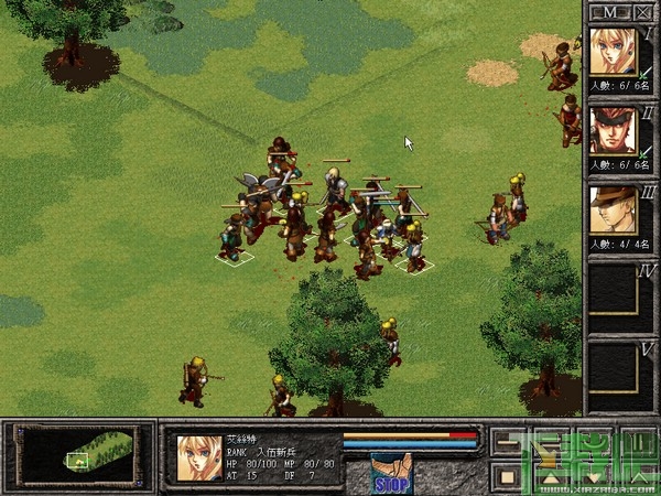 圣眼之翼的兵种:共有8种可用兵种:男战士、女战士、弓箭手、铁甲兵、僧侣、魔法师、侦察兵、火炮兵。 男战士和女战士为我的攻击主力,男战士攻防较强而女战士速度较快,但大致上没有什么差别;弓箭手为攻击辅助但却起了至关主要的作用;铁甲兵攻防很不错对弓箭有一定防卸作用,但速度太慢有违我的战术思想;僧侣当然是加血用的;侦察兵的主要作用是侦察和吸引敌人,因为他的侦察范围大而且速度最快,当然他的地雷也可起到阻敌和杀伤的作用,但他最有力的武器却是他超高的攻击频率,对战争初期的重装甲兵能在一对一的情况下不伤血地杀掉;魔法师和火炮兵我不太喜欢,魔法的攻击火力虽然很强但对敌我却不能识别不能和其他兵种混合使用;火炮兵则更加气人,他攻击是平的一直线,会打在攻击方向的最近一个人身上,理所当然的就不能在其前面放置战士,而且如果敌人从侧面攻击的话必须改变队形后再攻击,如果对方有远程攻击部队(如弓箭手和魔法师)的话就会被其先行攻击而火炮兵的HP只有60。 圣眼之翼的阵形:共有8种阵形但有用的却不多,一般情况下我只用方阵。但孤线阵形在"桥"那版却很好用(可以集中火力)。当然对于火炮兵的阵形的话就要认真的选择了但本人不太善于。 圣眼之翼的配属总共可有5只小队但却只能有30个战士出场我觉得太少的一点。这也是我舍去魔法师和火炮兵的原因。 敌人一只分队的实力一般为3-6个战士,3-6个弓箭手,1-2个魔法师(最差的部队也可能没有弓箭手和魔法师)。所以我的部队一般为9人这样就能保证3:2的攻击实力。 我一般有2支主战部队,男战士1支,女战士1支,1 支弓箭手部队。在圣眼之翼中兵力集中是很重要的,所有在以上的3支部队中我都配属的9人。第4支部队是我的僧侣部队一般为2人,因为加上女主角的加血能力应该能满足需要。第5支部队是我的1个侦察兵。 圣眼之翼的地形效果高处打低处非常的合算。因为走斜坡时速度会减慢,而且高处打低处时弓箭手的攻击力和射程会有一定的增加。而敌人在高处时你要么用侦察兵把他们引下来,要么就用弓箭手射,这就是我的观念--集中就是胜利。在城镇里就很麻烦了,因为房屋,树都可在一定范围内挡往弓箭手的箭。PS:一定范围的意思是只要弓箭离开房屋有一定距离,就可以把箭中房屋上面射过去。 圣眼之翼的战术本人在战术运用中最多运用的是侦察兵和弓箭手。 在圣眼之翼的初期 只要用侦察兵把敌人引过来,弓箭手伤害,战士料理后事。但对弓箭手的话不能用战士而且要把战士往后退,因为敌方弓箭手一射到我方战士就会向它冲去,面敌方的弓箭就会往后退,而战士又往前追,这样很容易在弓箭手后面的其它敌方士兵引出来,这样就会发生大混战,很可能会出现1打3的情况,这样就很可能造成战士的死亡,所以一般是用弓箭手消灭弓箭手,用战士消灭战士。魔法师是最危险的人所以要在他当出现时就要用弓箭手的箭把他射死。如果是对怪物作战版要注意不要让你的人落单,就是以侦察兵的速度也对付不了蜘蛛怪物的快速进攻。 在圣眼之翼游戏的中期 用侦察兵引敌人就不一定引的过来的,还有一些敌人看见你就会逃,但这不是真正的逃而是要引你冲上去,而你上去后就会发现他们集中了2个分队的实力也就是6-12个战士,6-12个弓箭手。但由敌人的这种后退是程式性的,所以就是你打他们,他们也不会还手,所以侦察兵的速度就在这里有用了,侦察员很容易地冲去杀掉最后的一个人。然后逼近敌人的部队把敌人吸引过来而敌人不会一直跟着以回本阵。所以一般是在一边走一边埋雷,一次吸引一般能杀掉3-4个人,如果后面有3个弓箭手的话那我的侦察员就会冲上去杀,1:3我的侦察兵应该可以胜。 本人玩圣眼之翼现在只玩至第五章,以上就是至第五章我总结出的浅见,我主要的思想就是集中兵力和先发至人:以尽可能多的人打尽能少的人,在敌人(由其是魔法师)没有出手前出手。