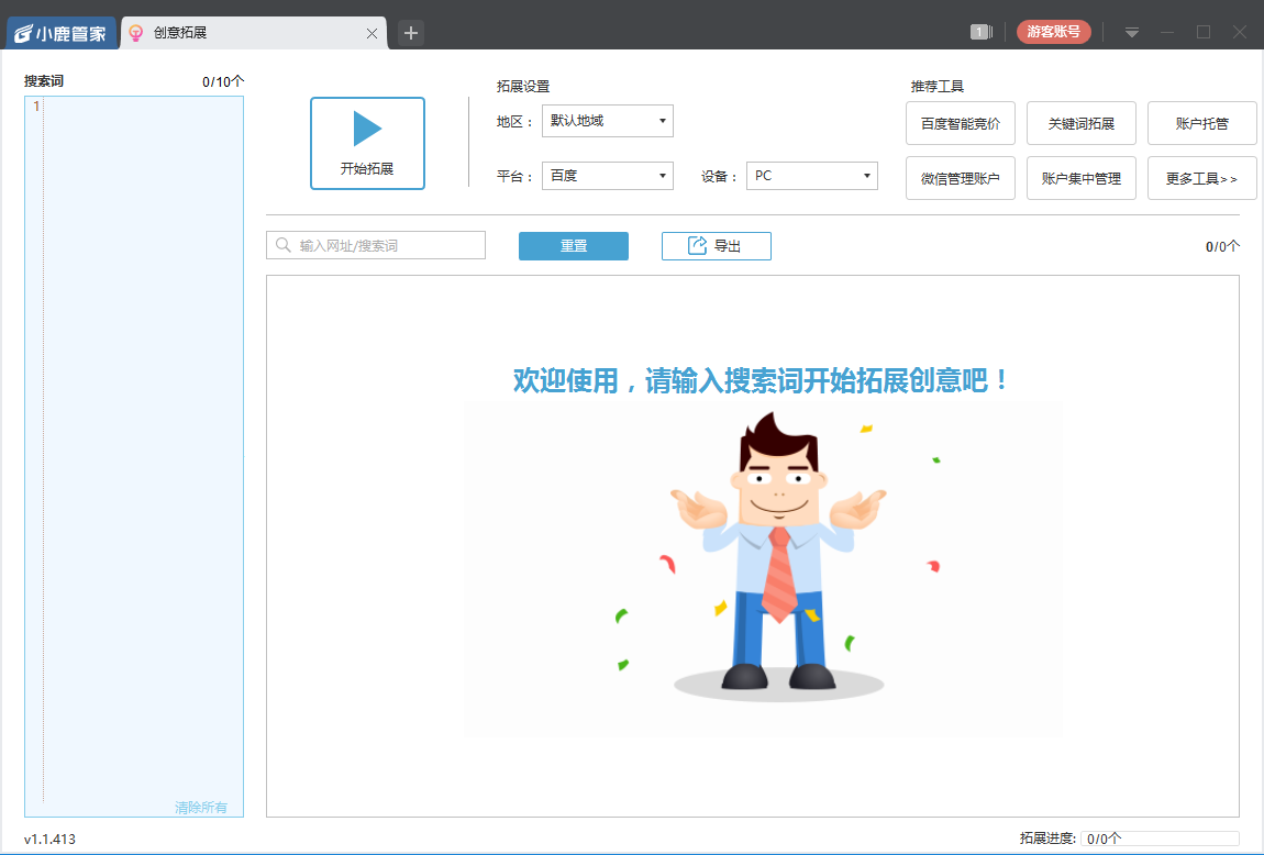 1、完成软件安装双击软件进入小鹿管家创意扩展页面,该页面可以通过输入关键词进行创意扩展
