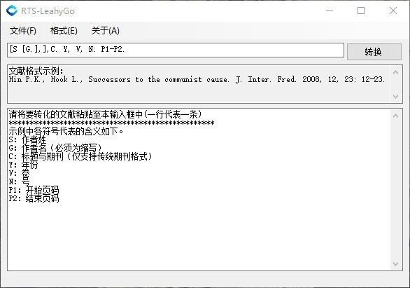 RTS-LeahyGo是一款非常简单且实用的文献格式修改工具,可帮助用户快速将文献格式进行修改,具备简洁直观的操作界面,旨在为用户提供最简单的操作,只输添加要转化的文献,进行简单设置,通过几个简单的步骤一键即可进行转换,快速且准确的输出指定格式的文献,提供文献格式示例,可查看具体的文献格式,根据所给提示编辑相应的修改规则,按照指定的规则进行修改,修改后的结果直接显示在软件界面,便于查看,总而言之,这是一款非常好用的软件,如果您有需要,那就赶快下载体验一下吧!