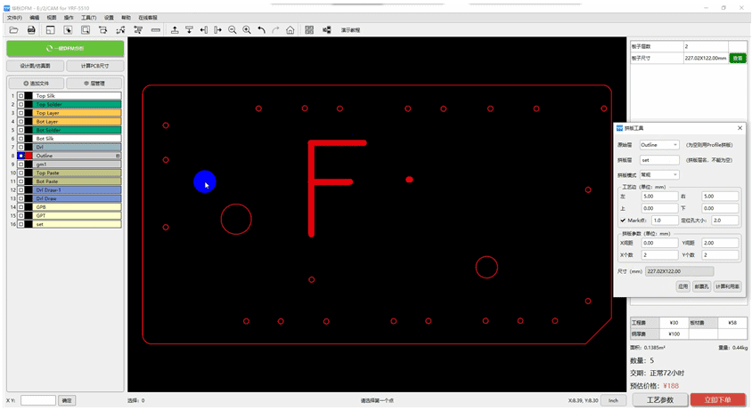 连片拼板:智能拼板工具,可自定义工艺边大小、拼板间距、拼板个