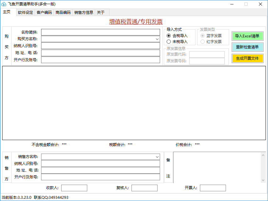 飞鱼开票清单助手是一款简单实用的开票管理软件,该软件支持增值税、普通或者专用发票生成、支持Excel清单导入、支持清单检测等功能,可以帮助用户快速开票、导出导入票据数据,提高用户开票工作效率;该软件支持开票清单数据有效性和格式进行预审检测、自动分票等功能,可以帮助用户快速高效的进行票据生成,非常方便好用;飞鱼开票清单助手这款软件功能强大、操作简单,支持一键导入导出商品编码和客户编码文件,非常方便好用,有需要的用户可以下载使用。
