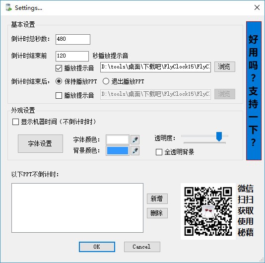 FlyClock是一款非常简单且实用的PPT倒计时软件,可帮助用户在PPT播放时,进行倒计时,当我们在参加比赛时,经常会使用到PPT,而比赛都有一定的时间要求,因此把握好PPT播放时间很重要,这时候就可以用到这款软件,可在不影响PPT播放,也不影响比赛中的讲解,自动进行倒计时,可自定义设置倒计时总秒数,如本次比赛要求时间,还可在指定的时间进行提示,快要结束前,提示比赛结束时间快要到了,提醒您把握好时间,顺利完成比赛,可选择自己喜欢的音乐进行提示音设置,支持外观设置,欢迎有需要的用户下载体验