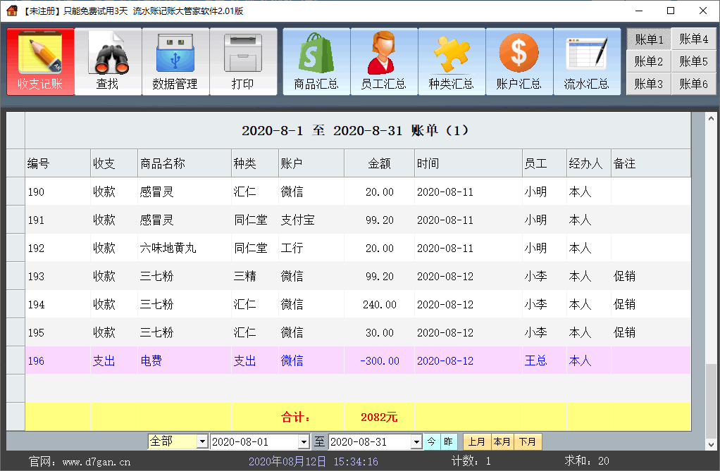 流水账大管家是一款服务于企业或者个体商户的商业记账软件,软件的记账方式简单实用,可以降低企业的培训时间和费用,这得益于软件简洁的界面和易于操作的工作方式,让用户不必在使用软件上花费太多的时间,仅仅需要几个小时就可以熟练的使用这款工具,该工具费免费软件,用户使用正式版本时需要支付一定的费用;整体上这款软件与其它的财务记账软件相比会更加的方便,需要的朋友可以先下载进行试用体验,正式版本绑定电脑,意味着软件只能在一台电脑上使用。