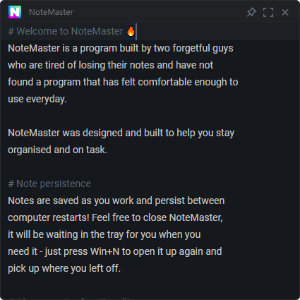 NoteMaster是一款简约的的文本记录工具,软件采用人性化的设计风格,界面简洁干净,给用户一种的小清新的感觉,软件的界面采用暗黑色的配色,可以有效降低长时间使用电脑对眼睛造成的伤害,还有一项更为人性化的功能是软件可以一边记录文字一边自动保存,该功能可以预防用户在毫无准备的情况下突然断电或者奔溃等造成的文本内容丢失的情况;NoteMaster是一款开源的笔记工具,用户可以免费使用所有功能,并且之后也可以免费进行程序更新,就程序来说它可以实现很多专业编辑器能实现的功能,但界面却没有其它编辑器一样杂乱,因此这款软件非常适合喜欢简约风格的用户。