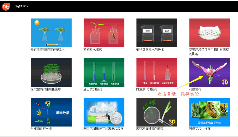 3、进入实验界面,在左侧的目录菜单中选择需要进行观察的类目。