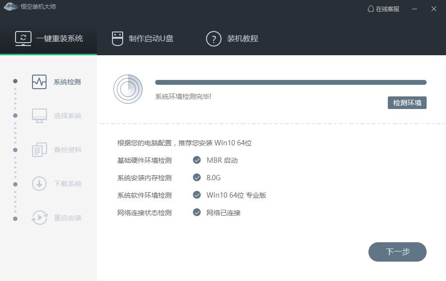 系统检测。下载软件完软件后正常打开(“一键重装系统”), 程序会默认检测当前系统环境,检测完成后,点击“下一步”。