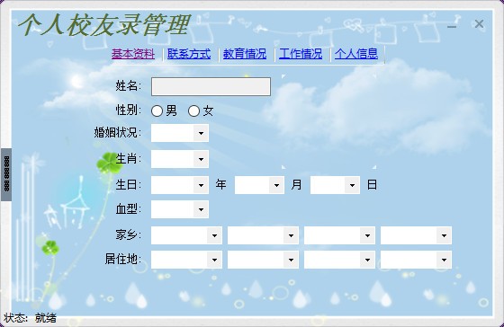 同学信息管理工具是一款非常专业且优秀的同学信息管理软件,可帮助用户快速将同学信息进行管理,毕业后,很多同学可能都很少联系或者已经失去联系,大多数时候是丢失了联系方式,若您想将同学信息进行记录,便于以后联系同学,就可以用到这款软件,拥有简洁清新的界面,给人一种很轻松舒适的感觉,将同学信息进行了细分,包括基本资料、联系方式、教育情况、工作情况和个人信息五个方面,全面且详细的记录了同学的信息,可直接查看各个方面的信息,使用起来很方便,欢迎有需要的用户下载体验
