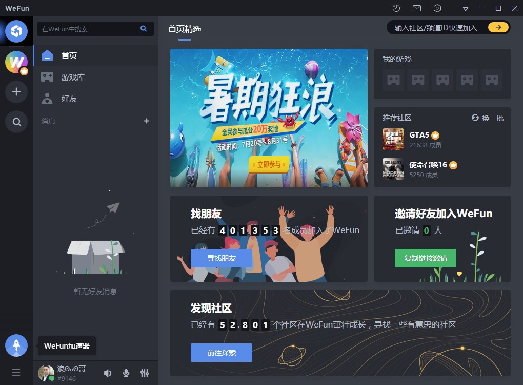 3、完成软件登录后进入软件游戏通讯首页,该页面可以点击参与软件活动、找朋友、邀请好友等操作