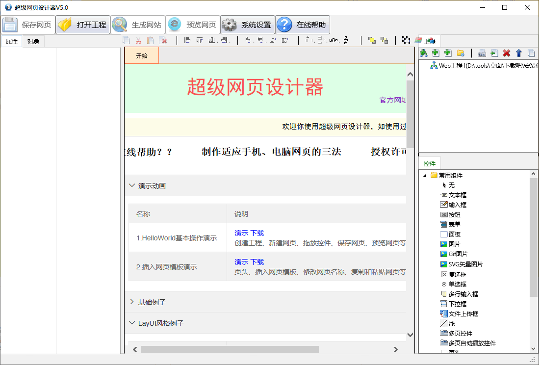 2、超级Web设计器内置了许多常用控件,例如文本框,输入框,按钮,表单,面板,图片,SVG图像,复选框,单选框等。